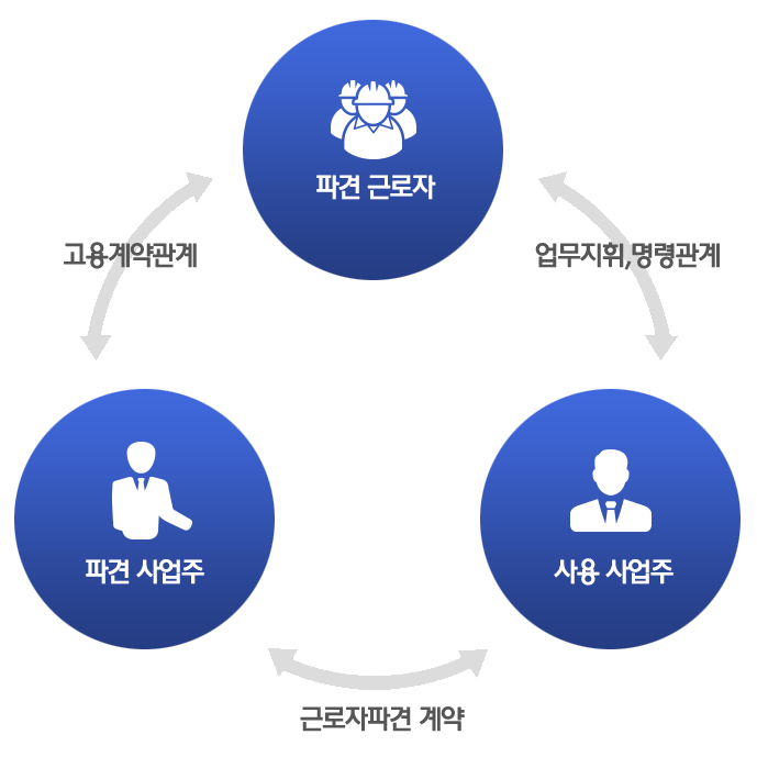 근로자파견은 파견사업주가 근로자(파견근로자)를 고용한 후 그 고용관계를 유지하면서 사용사업주에 파견하여 사용사업주의 지휘명령을 받아 종사하게 하는 것으로 타인의 노무를 이용하는 형태입니다. 즉, 근로자파견이란 고용과 사용이 분리되는 것으로 파견사업주가 근로자를 고용한 후 그 고용관계를 유지하면서 근로자파견계약의 내용에 따라 사용사업주의 지휘명령을 받아 사용사업주를 위한 근로에 종사하게 하는 것을 의미합니다.
